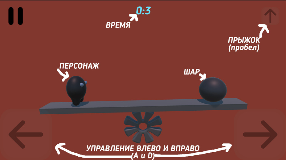 Если шар упадёт с платформы, то игра проиграна и начинается заново. Цель игры – постараться удержать мяч на платформе как можно дольше, управляя персонажем. Персонаж может ходить и прыгать по платформе.
