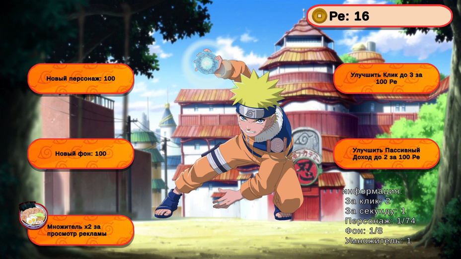 В игре вы сможете открывать разнообразные фоны (локации), которые прекрасно передают атмосферу вселенной Наруто. Каждый фон имеет свои уникальный визуальный стиль. Кроме того, вы сможете прокачивать свой клик и улучшать пассивный доход, чтобы получать больше Рё.