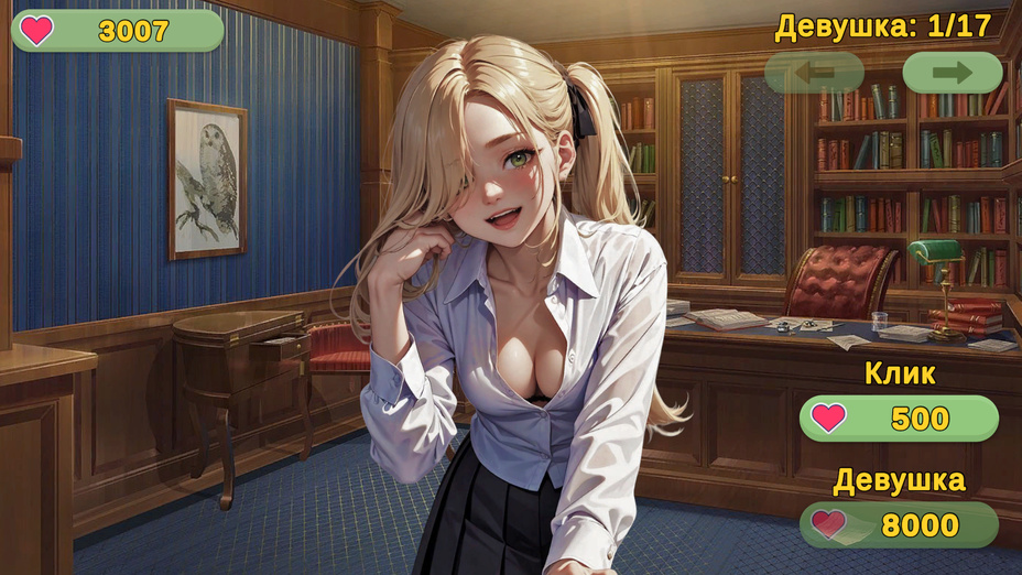 Кликай на девушек, чтобы зарабатывать сердечки. Улучшай клик, открывай новых девушек. Счет увеличивается при клике на девушку. Цель игры – открыть всех девушек.