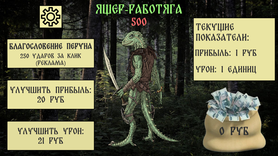 Игра “Русы против Ящеров” представляет собой уникальный кликер, который не только имеет свою неповторимую атмосферу, но и гениальнейшую систему уровней и сильнейший сюжетный контраст. Фабула игры имеет очень глубинный смысл, до которого игроку необходимо додуматься самому. Пользователь может сам выбирать свой темп игры, прокачивать силу удара, увеличивать свой доход и даже попросить помощи у высших сил при прохождении. Более того, в игру включён оригинальный саундтрек исполнителей, являющихся истинными потомками Русичей. Музыка помогает создать незабываемую атмосферу игры.