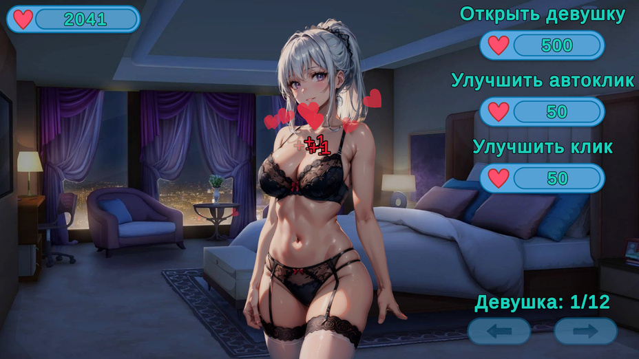 Кликай на девушек, чтобы зарабатывать сердечки. Улучшай клик, открывай новых девушек. Счет увеличивается при клике на девушку. Цель игры – открыть всех девушек.